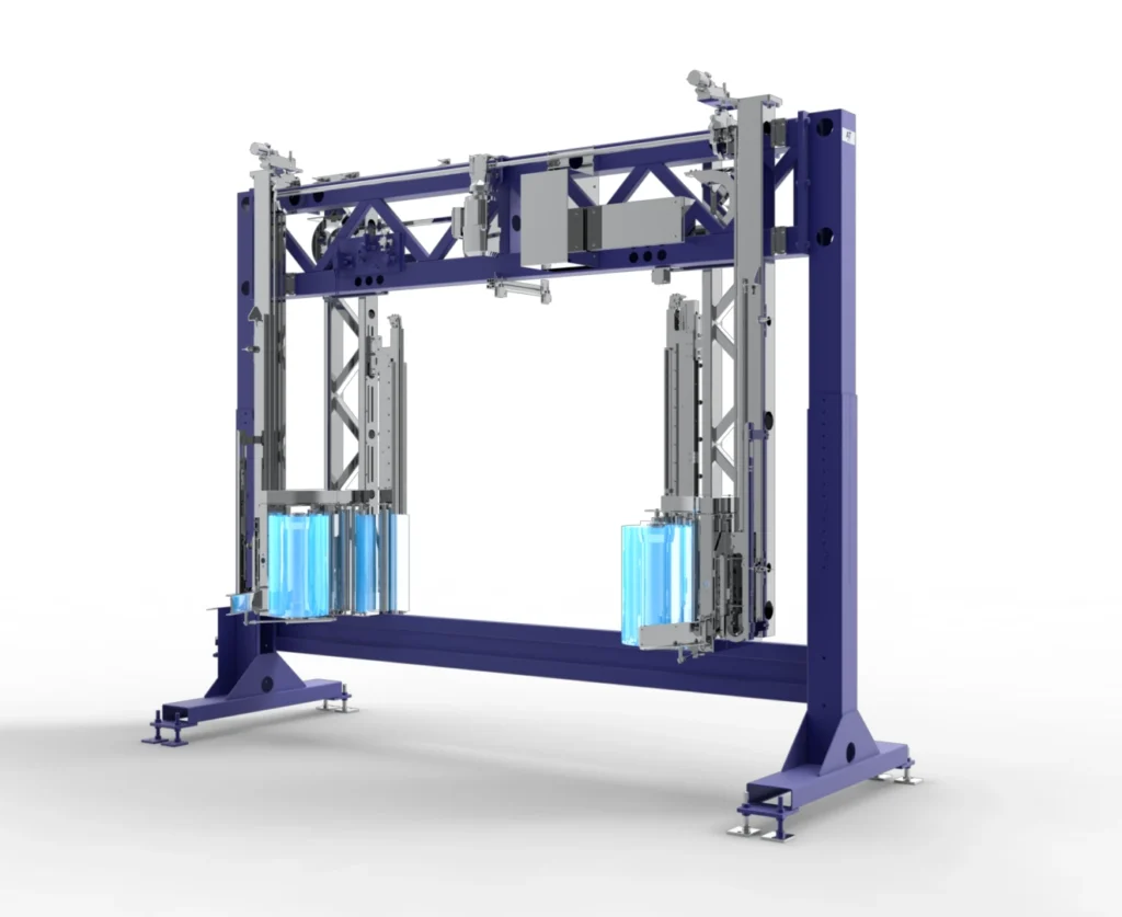 Este modelo envuelve el producto mediante dos cortinas planas de film estirable, que se sueldan entre sí, formando una cobertura uniforme que protege la carga durante el transporte y la manipulación.