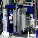 El grupo soldador, integrado en el mismo carro, se desplaza lateralmente mediante guías, permitiendo que los tampones de soldadura mantengan un contacto perfecto con el palet, incluso cuando varían sus dimensiones.