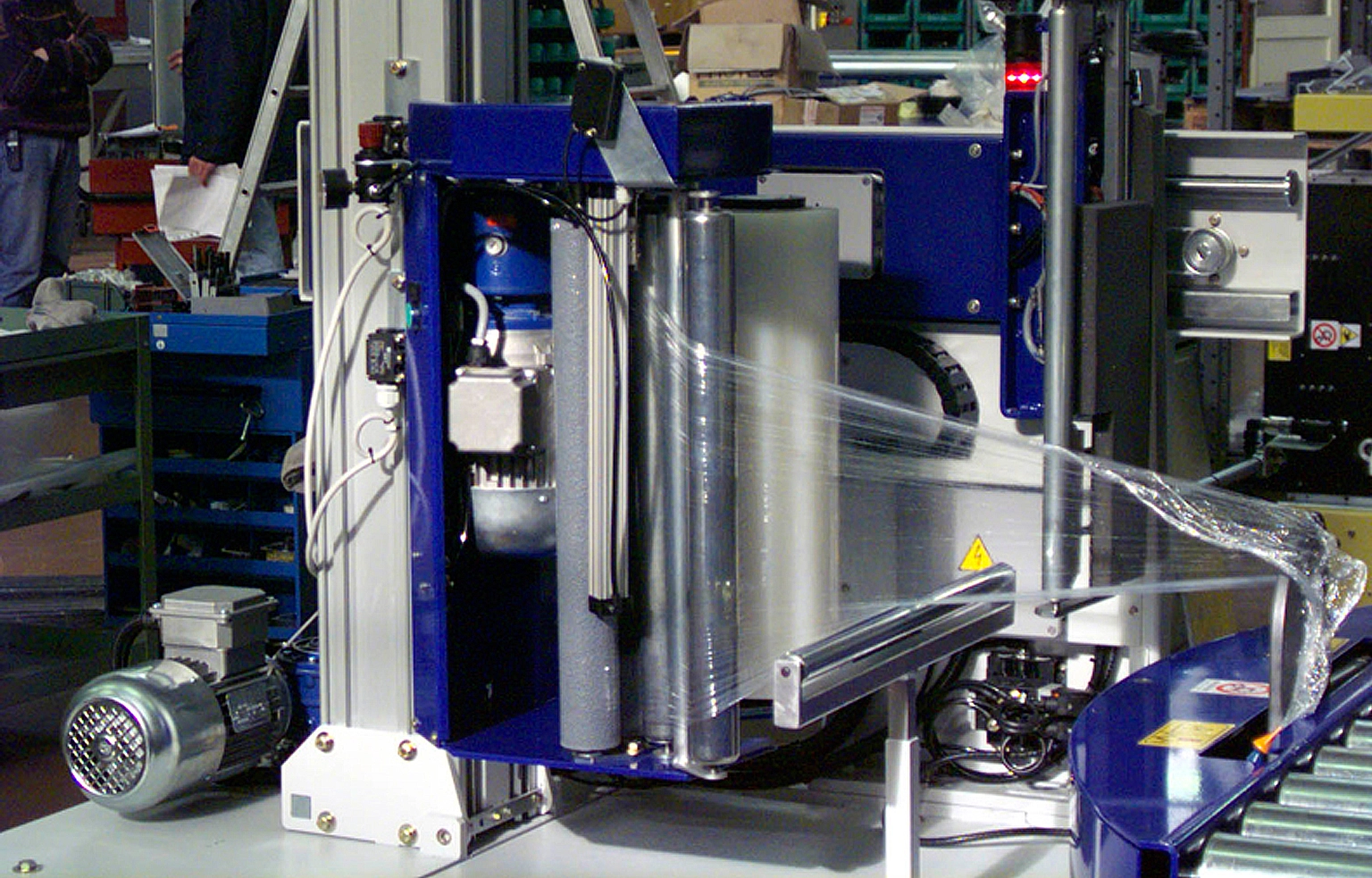 El grupo portabobinas, accionado por motorreductor y controlado por convertidor de frecuencia, permite un paso variable del film, adaptando la envoltura a cada tipo de carga.