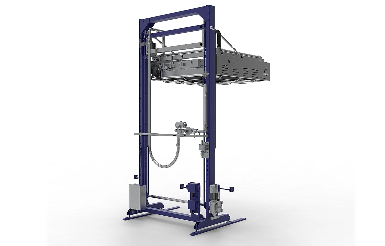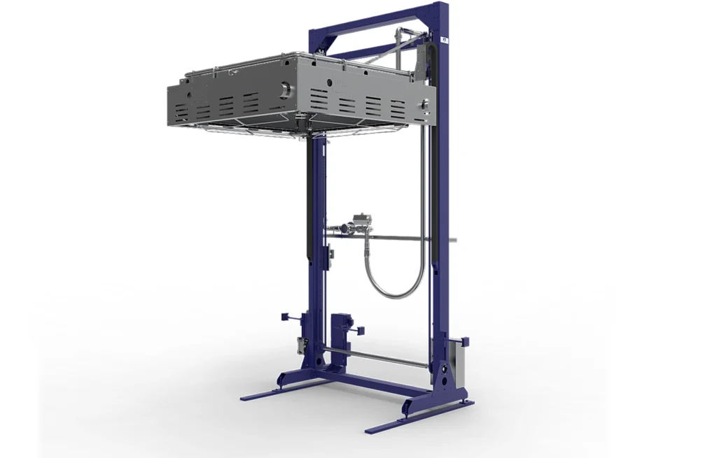 El arco móvil del horno incorpora quemadores de aire caliente sin llama, que se desplazan verticalmente alrededor del producto para calentar el film de forma uniforme. Este diseño elimina riesgos de incendio y asegura una combustión perfecta, controlada por detectores de llama que supervisan constantemente el proceso y previenen cualquier posible fuga de gas.