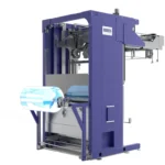 Un sistema mecánico de precisión transporta verticalmente el saco hasta la parte superior del arco, donde el film se recoge en cuatro dispositivos especiales, se estira y se adapta perfectamente a las dimensiones del producto, garantizando un ajuste uniforme y seguro.