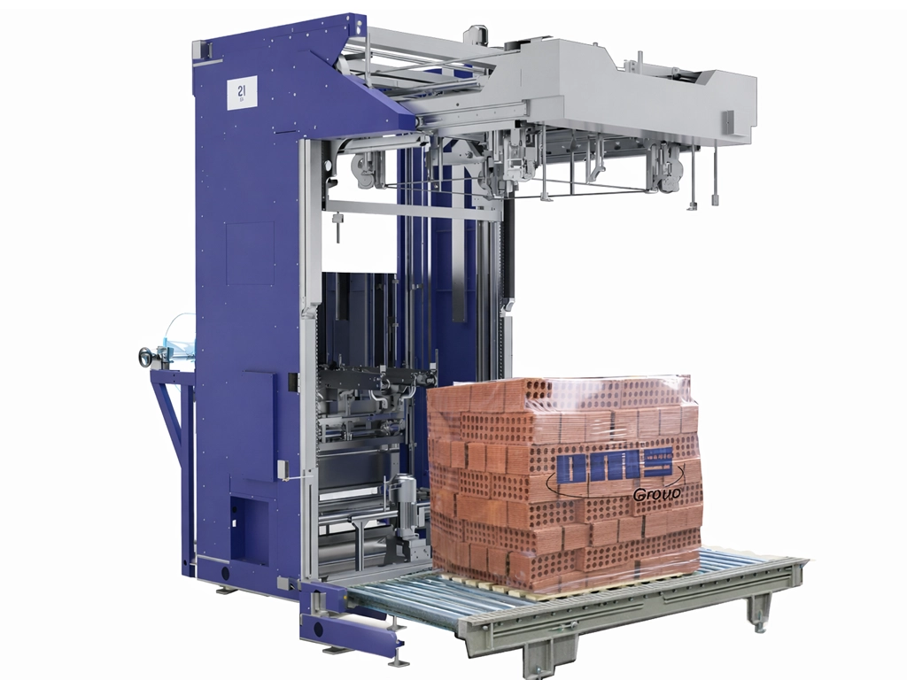 La máquina recibe el producto a través del transportador de entrada y, mediante fotocélulas láser autorregulables, controla el gálibo del palet para evitar colisiones en caso de productos fuera de medida o mal formados.