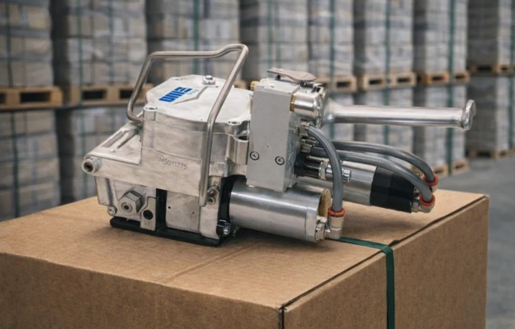 Gracias a su funcionamiento mediante aire comprimido, la OMS 11 ofrece un flejado potente y uniforme con flejes de polipropileno (PP) y poliéster (PET), siendo una solución ideal para líneas de embalaje con infraestructura neumática y altos ritmos de trabajo.