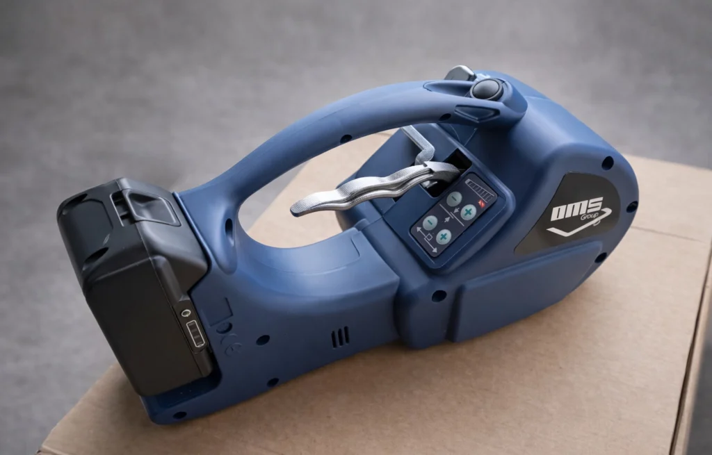 Como flejadora manual de batería, la OMS 22 permite trabajar sin aire comprimido ni conexiones eléctricas, facilitando el flejado en almacenes, centros logísticos, zonas de expedición y líneas de producción.