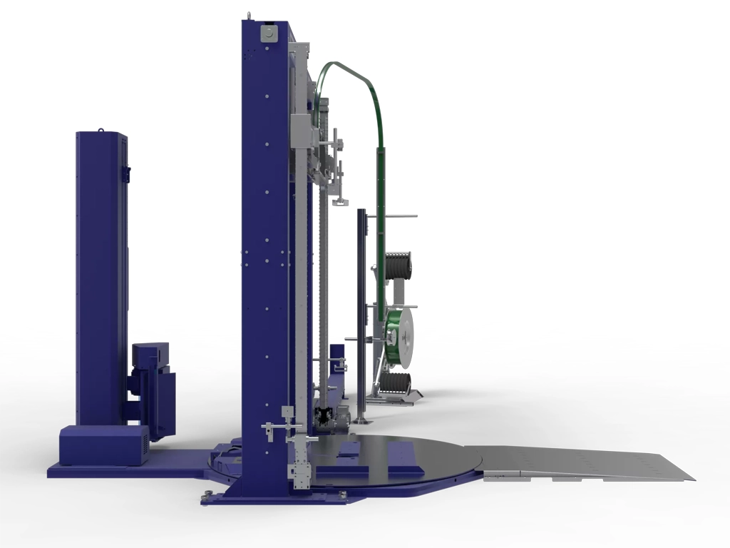 Este sistema permite realizar en una sola estación el flejado vertical y el enfardado del palet, optimizando el final de línea y garantizando la máxima estabilidad de la carga durante el transporte, la manipulación y el almacenamiento.