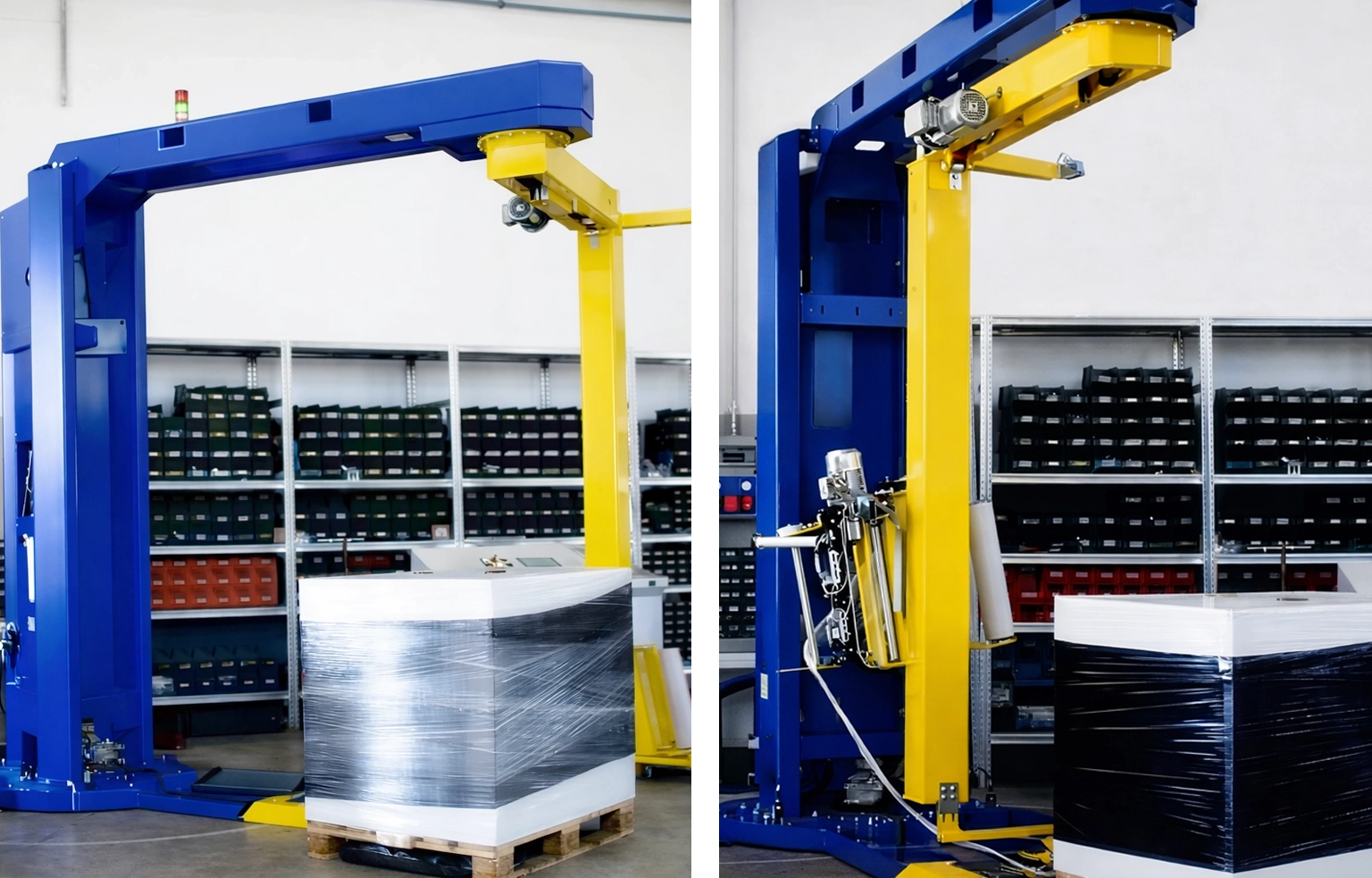 Su estructura robusta y su diseño optimizado garantizan una estabilidad máxima de la carga, incluso con palets inestables, ligeros o de grandes dimensiones, sin necesidad de mover el producto durante el ciclo de enfardado.